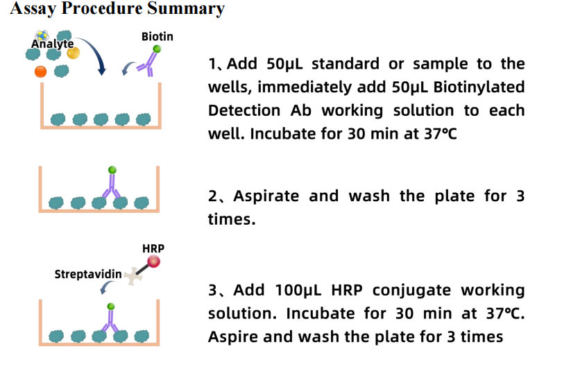 4. Biotinylated Detection Ab working solution: Calculate the required amount before the experiment(50μL/well). In preparation, slightly more than calculated should be prepared. Centrifuge the Concentrated Biotinylated Detection Ab at 800×g for 1 min, then dilute the 100×Concentrated Biotinylated Detection Ab to 1×working solution with Biotinylated Detection Ab Diluent (Concentrated Biotinylated Detection Ab: Biotinylated DetectionAb Diluent=1:99).